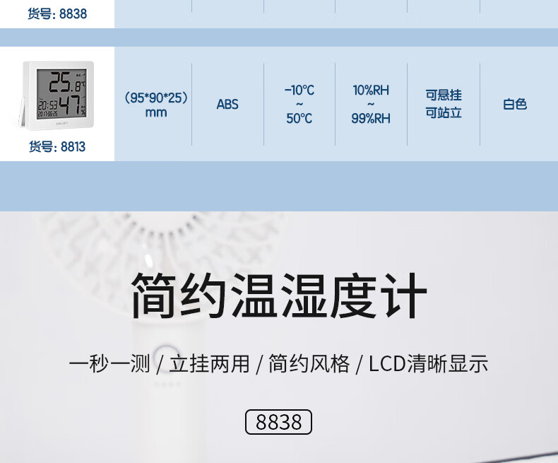 得力/deli 8838 溫度計量標(biāo)準(zhǔn)器具 LCD電子室內(nèi)溫濕度計 一秒一測 吸附站立兩用式