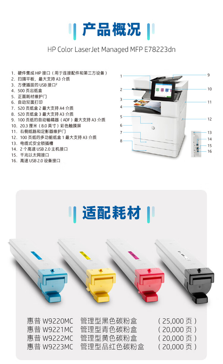 惠普(HP)A3激光復合機打印機辦公商用大型一體機復印機掃描機 A3黑白 E82550z(50頁/分鐘) 官方標配