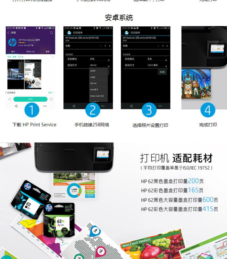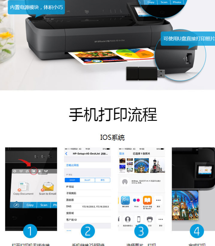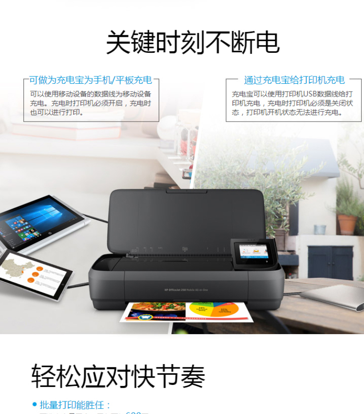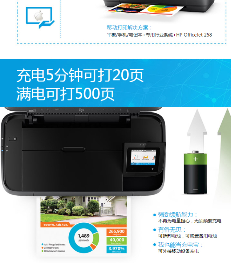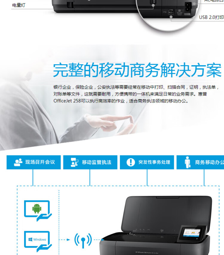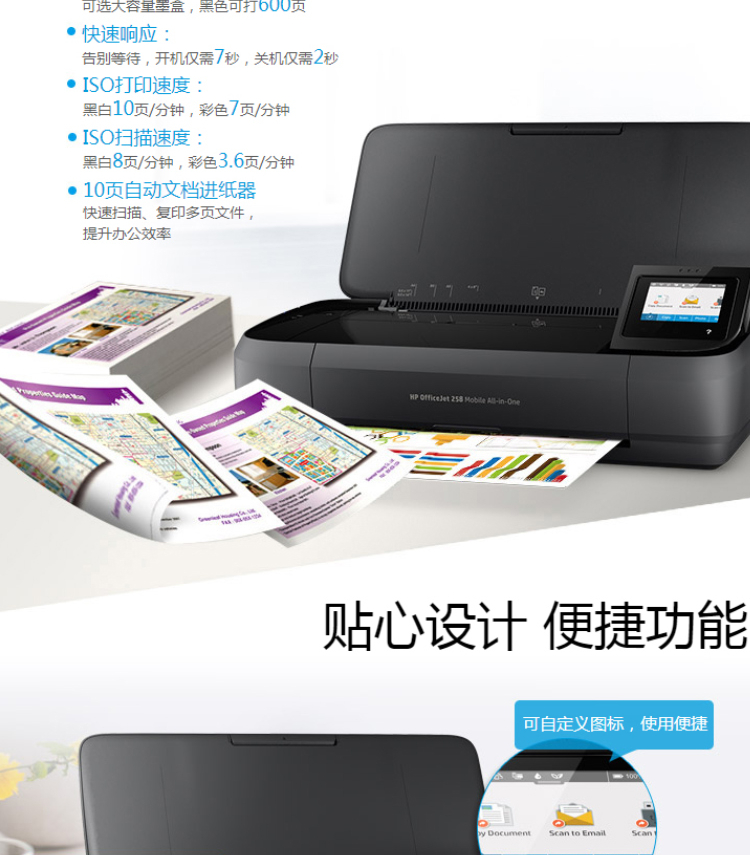 惠普(HP)OfficeJet 258 A4 彩色單功能移動便攜式打印一體機 無線打印