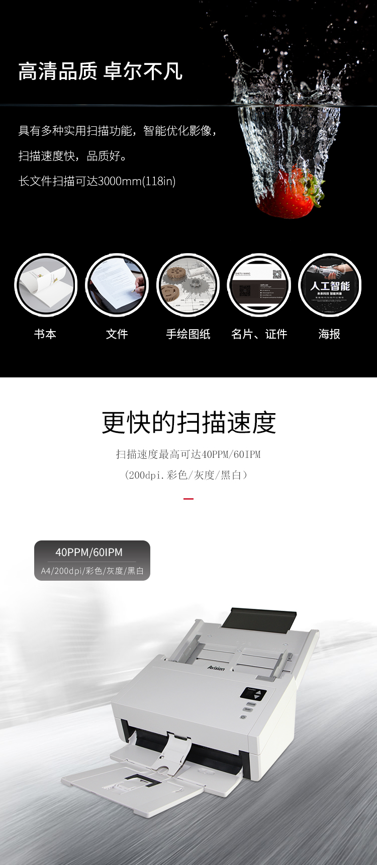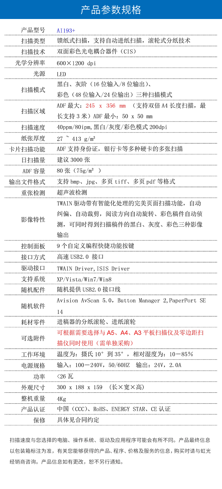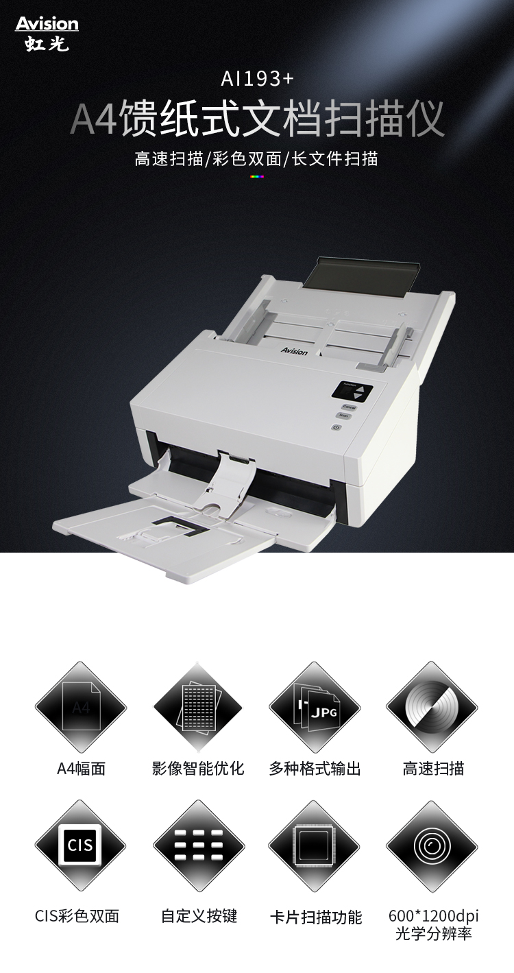虹光(Avision)AI193+ A4饋紙式彩色雙面高速文檔掃描儀 商務(wù)掃描/自動雙面掃描